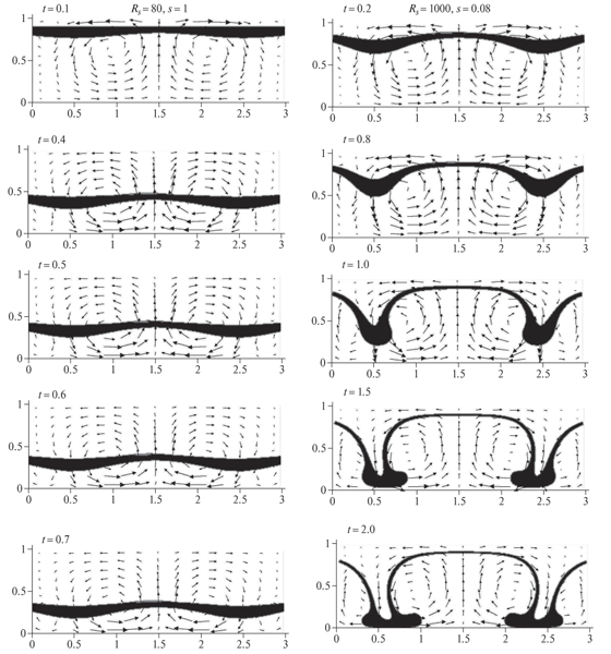 На рис. 3 приведены результаты решения для осаждения слоя при значении седиментационного числа RS = 100. В левой колонке начальное положение возмущенной нижней границы слоя взято в виде z = 0.2 + 0.03sin(πx), а в правой z = 0.2 + 0.03sin(3πx). Как видно на рис. 3, при осаждении слоя частиц возмущения при k = π и при k = 3π почти не растут, так что слой практически не деформируется во время падения. Появляются скорости течений, обусловленные неровностью границы, но эти скорости не растут, и деформации слоя не увеличиваются.