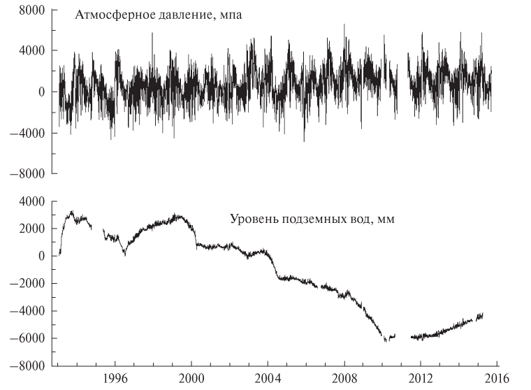Изменения уровня подземных вод несут информацию об объемных деформациях в земной коре. Если скважина пробурена во флюидонасыщенный горизонт достаточной мощности, то вариации уровня будут характеризовать объемные деформации, определяющие региональные процессы в земной коре. Анализ данных о вариациях уровня воды в скважине позволяет исследовать лунно-солнечные приливные процессы в твердой земле [Bredehoft, 1967; Rojstaczer, Agnew, 1989; Багмет и др., 1989; Любушин и др., 1997; Виноградов и др., 2011], а также получать данные об изменчивости свойств земной коры в данном районе по отклику изменения уровня на изменения атмосферного давления [Любушин, Малугин, 1993; Любушин, Лежнев, 1995; Копылова и др., 2009]. Долговременные наблюдения в сейсмически активном районе могут дать информацию о предвестниках землетрясений [Roeloffs, 1988; Roeloffs et al., 1989; Igarashi, Wakita, 1991; Копылова и др., 2000; Копылова, 2001; 2006; Болдина, Копылова, 2017], а информация, полученная в асейсмических, платформенных областях, необходима для выявления путем сравнительного анализа развития аномальных процессов в сейсмоактивных районах [Киссин, Гумен, 1994].