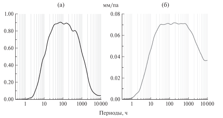 Оценки передаточных функций строились классическим непараметрическим методом, основанным на преобразовании Фурье «входных» (атмосферное давление) и «выходных» (вариации уровня) сигналов, вычислении их взаимной спектральной функции и спектра мощности «входа» (с помощью усреднения периодограмм и кросс-периодограммы) и отношения кросс-спектра к спектру мощности [Brillinger, 1975]. Большой диапазон периодов создавал технические трудности для получения оценки сразу по всей выборке. Поэтому оценки строились сшиванием трех различных оценок. Для периодов от 20 мин до 10 ч оценка строилась путем усреднения для каждого значения частоты кросс-периодограмм исходных 10-минутных временных рядов, полученных в скользящих временных окнах длиной 2048 отсчетов (с предварительным удалением локальных линейных трендов в каждом окне и последующим переходом к приращениям) и завершающим усреднением по частоте скользящим частотным окном радиуса 20 значений частоты (9.7x104 мин1). Для периодов от 10 до 100 ч оценка строилась аналогично, но для временных рядов после перехода к 1-часовым отсчетам (путем усреднения и прореживания в 6 раз исходных рядов), при этом радиус окна частотного усреднения стал равен 9.7x103 ч1. Наконец, для оценки для периодов от 100 до 10000 часов осуществлялся предварительный переход (после усреднения и прореживание исходных данных в 144 раза) к 1-суточным отсчетам, оценка строилась аналогично, но при этом длина скользящего временного окна бралась 1024 отсчета, а радиус частотного усреднения 10 значений частоты (9.7x103 сут1). Во всех случаях смещение временных окон бралось равным 1/8 от длины окна.