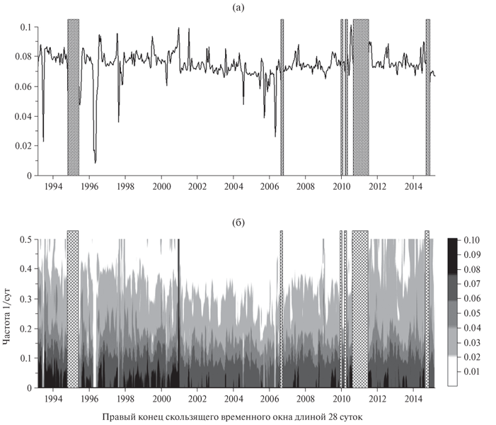 Рис. 3. (а) – График максимального значения для каждого временного окна; (б) – частотно-временная диаграмма амплитудной частотной передаточной функции. Заштрихованные прямоугольники соответствуют временным интервалам, в которых доля искусственных (восполненных) значений временных рядов превышает 2% от длины окна. Минимальная частота на диаграмме (б) соответствует максимальному периоду, равному длине окна, то есть 28 суткам.