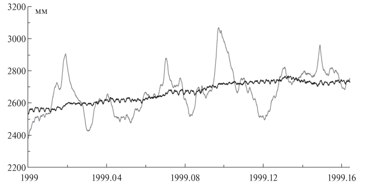 На рис. 4 представлены графики исходного и компенсированного уровня подземных вод для 2-месячного временного фрагмента для начала 1999 г. Видно, насколько более четко выделяются приливные вариации уровня в компенсированном сигнале по сравнению с исходными данными, где они «тонут» в вариациях, обусловленных влиянием атмосферного давления.