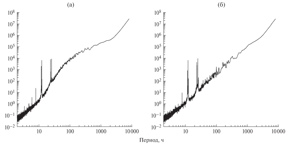 На рис. 5 приведены оценки спектра мощности вариаций уровней для исходных временных рядов и после компенсации влияния атмосферного давления. На рис. 5б видно, что очень надежно выделяются 12-и 24-часовые группы приливных гармоник, причем спектральные пики на периодах, соответствующих высшим обертонам суточного колебания 6, 4 и т.д. часов, присутствующие на спектре мощности исходного сигнала, после компенсации исчезли. Это свидетельствует о том, что они обусловлены влиянием негармонической формы суточного колебания атмосферного давления. Кроме того, следует подчеркнуть выпрямление графика спектра мощности (в двойном логарифмическом масштабе) после компенсации влияния давления полностью исчез «горб» на спектре мощности для периодов от 10 до 3000 ч.