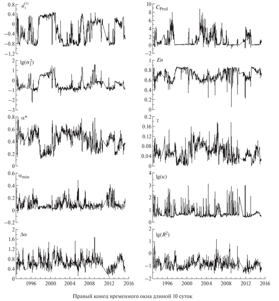 На рис. 6 представлены графики изменения компонент 10-мерного вектора свойств временного ряда в зависимости от положения правого конца последовательных временных окон длиной 10 суток.