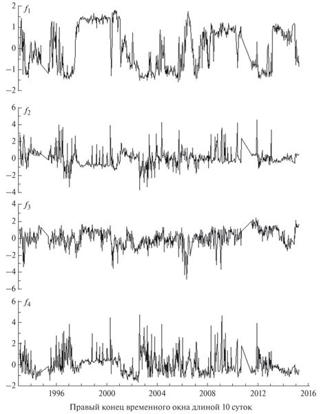 Рис. 7. Графики 4 ортогональных общих факторов набора 10 свойств временного ряда уровня подземных вод после компенсации влияния атмосферного давления в последовательных окнах длиной 10 суток.