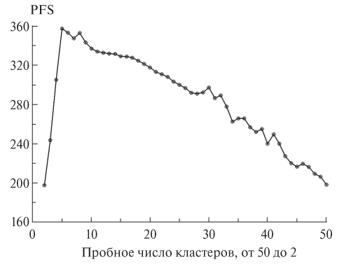 На рис. 8 представлена зависимость псевдо-F-статистики от числа пробных кластеров, из которой видно, что оптимальное число кластеров в пространстве ортогональных общих факторов равно 5.