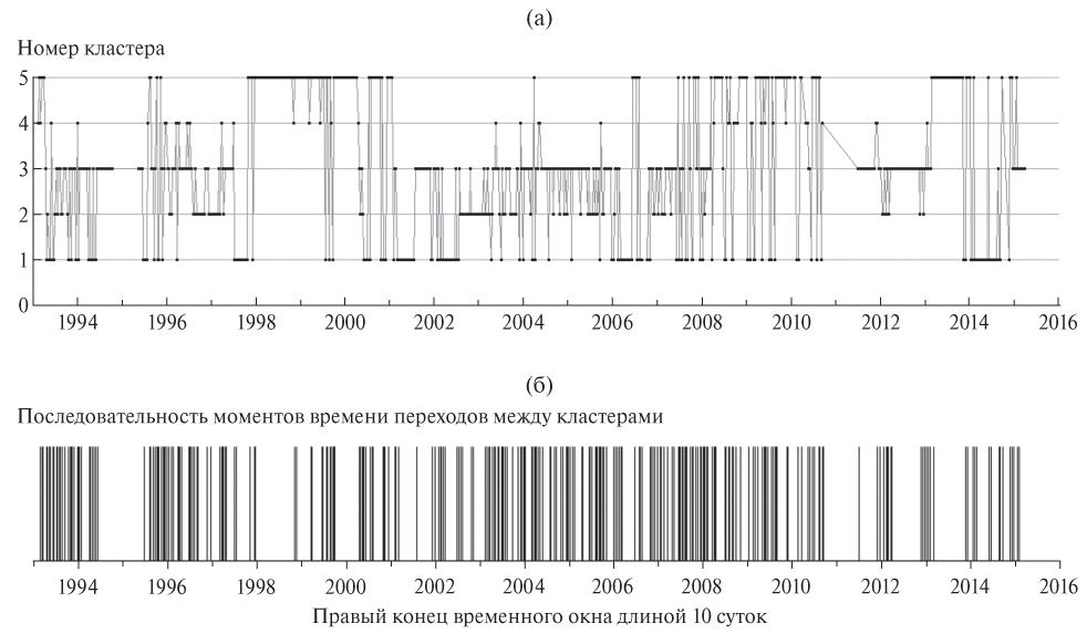 Рис. 9. (а) – Последовательность 5 кластеров в пространстве 4-х общих факторов статистических свойств временных фрагментов длиной 10 суток временного ряда уровня подземных вод после компенсации влияния атмосферного давления (рис. 7); (б) – последовательность 279 переходов между кластерами.