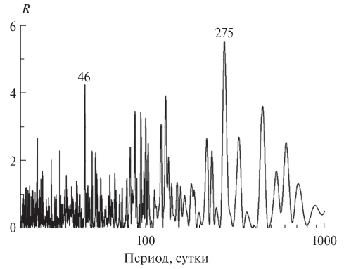 Непосредственное применение изложенного метода спектрального анализа последовательности событий, представленной на рис. 9б затрудняется наличием достаточно длинных пропусков данных в 1995 г и в конце 2010 г. Такие пропуски данных могут привести к появлению ложных низкочастотных компонент. Поэтому рассмотрим последовательность 217 переходов между кластерами лишь для интервала времени от 22.06.1995 до 10.09.2010 гг., когда не было длинных пропусков регистрации. На рис. 10 представлен график функции (27), вычисленной для 2000 пробных значений периодов в равномерной логарифмической шкале от 20 до 1000 суток. Из этого графика следует, что у переходов между кластерами есть 2 значимых периода (с вероятностью принятия гипотезы о существовании таких периодичностей не менее 98%) с периодами 46 и 275 суток.