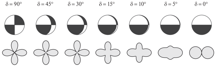 Исследование особенностей излучения длиннопериодных поверхностных волн мелкофокусным землетрясением, проведенное в работах [Букчин, 2006; Bukchin et al., 2010], показало, что в случае, когда одна из нодальных плоскостей источника субгоризонтальна, небольшие изменения ее угла падения существенно меняют диаграмму поверхностно-волнового излучения такого очага и оценку моментной магнитуды события. Пример такого изменения диаграммы излучения фундаментальной моды волны Лява на периоде 200 с в зависимости от величины угла падения d приведен на рис. 1. Источники представляют собой сдвиги по простиранию с различными значениями угла падения d и фиксированными значениями угла простирания (y = 0°), угла подвижки (l = 0°) и глубины источника (h = 30 км). В верхнем ряду указаны текущие значения угла падения, в среднем ряду приведены соответствующие фокальные механизмы, а в нижнем ряду – соответствующие диаграммы излучения волны Лява. Как видно из рисунка, при изменении угла падения от 90° до 15° диаграмма излучения волны Лява почти не меняется, и лишь на последних десяти градусах, когда одна из нодальных плоскостей становится субгоризонтальной, небольшие изменения фокального механизма существенно меняют диаграмму поверхностно-волнового излучения. Как следствие, применяемые к таким событиям методы оценки углов фокального механизма должны обеспечивать достаточно высокий уровень их разрешения.