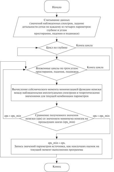 По описанному выше алгоритму была написана программа с распараллеливанием вычислений (данную программу MomTens_omp можно скачать с сайта ИТПЗ РАН http: //mitp.ru/en/soft). Одним из наиболее популярных средств параллельного программирования для компьютеров с общей памятью в настоящее время является технология OpenMP. Данная технология базируется на традиционных языках программирования, таких как Си, Си++ и Фортран. За основу берется последовательная программа, а для создания ее параллельной версии используется набор директив, функций и переменных окружения. Предполагается, что создаваемая параллельная программа будет переносимой между различными компьютерами с разделяемой памятью, поддерживающими OpenMP. Технология OpenMP нацелена на то, чтобы пользователь имел один вариант программы для параллельного и последовательного выполнения [Антонов, 2009]. Здесь мы рассматриваем возможность применения данной технологии для ускорения процесса определения параметров очага землетрясения по спектрам поверхностных волн. В общем виде алгоритм работы программы представлен на блок-схеме на рис. 2.