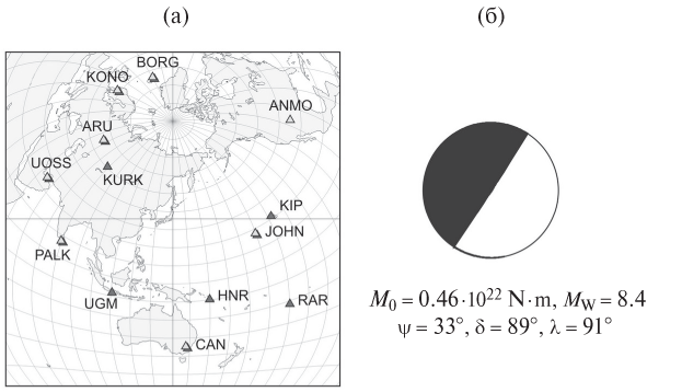 Описанный подход был использован для изучения сильнейшего афтершока землетрясения в Тохоку, произошедшего через полчаса после основного толчка. В результате его записи оказались сильно зашумленными излучением предшествующего главного события. С помощью программы спектрально-временного анализа СВАН мы отфильтровали в полосе периодов от 100 до 200 с и использовали для определения параметров изучаемого события фундаментальные моды Лява и Рэлея, зарегистрированные 13 станциями сетей IRIS, GEOSCOPE и GEOFON. Расположение этих станций приведено на рис. 3а. Шаг сетки для углов фокального механизма был выбран равным 1°. В таблице представлены фокальные механизмы и фазовые невязки для четырех эквивалентных решений, полученных из анализа амплитудных спектров поверхностных волн. Как видно из таблицы, оптимальным является решение 1, приведенное на рис. 3б. Полученные значения углов простирания, падения и подвижки: 33°, 89° и 91°, соответственно. Полученное значение сейсмического момента равно 0.46 × 1022 Нм. Это значение соответствует значению моментной магнитуды Mw = 8.4. Наша оценка глубины наилучшего точечного источника равна 10 км. Частные функции невязки для глубины источника и для углов фокального механизма, характеризующие их разрешение, приведены на рис. 4.