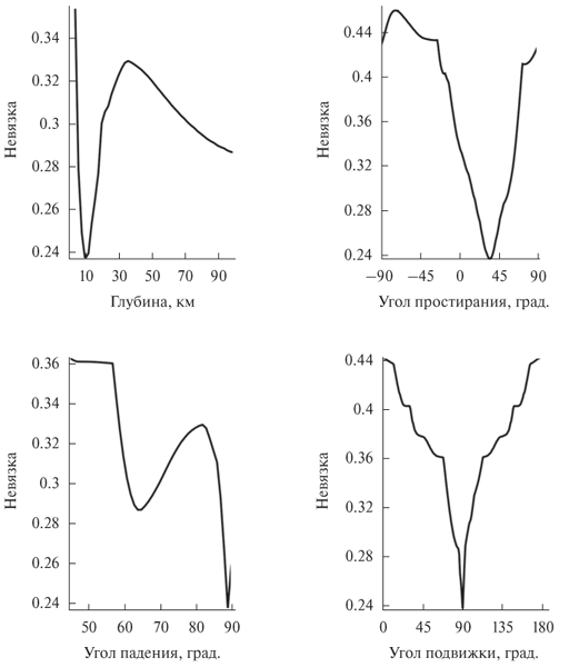 Рис. 4. Частные функции невязки для глубины источника и углов фокального механизма.