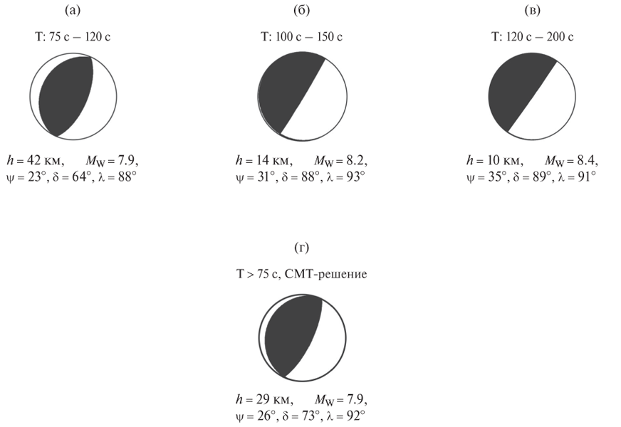 Сравним теперь решение, приведенное на рис. 5в, с ГСМТ-решением, представленном на рис. 5г. Эти решения существенно различаются. Так полученная нами оценка Mw равна 8.4, в то время как ГСМТ-оценка Mw равна 7.9. Заметим, однако, что сравниваемые решения получены по записям поверхностных волн, отфильтрованных в разных спектральных диапазонах. Если же мы сравним ГСМТ-решение (Т > 75 c) с решением, приведенном на рисунке 5а (75 c < Т < 120 c), то увидим, что эти решения весьма близки. Но как было отмечено выше, диапазон периодов 75 c < Т < 120 c является недостаточно длиннопериодным для рассматриваемого события. Это дает нам основание предполагать, что существенные отличия нашего решения от ГСМТ-решения объясняются неадекватным выбором спектрального диапазона наблюдений при расчете последнего.
