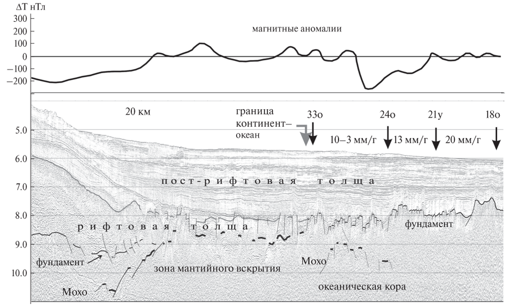 2) зона протоокеанической коры (между аномалиями 33 и 21), развивавшейся в условиях ультрамедленного спрединга и характеризующаяся контрастным рельефом, многочисленным сбросовыми нарушениям, которые могли служить каналами для магмоснабжения и экструдирования подушечных базальтов на дно (в этой зоне фундамент может слагаться породами нижней коры и серпентинитами верхней мантии); в западной части зоны протоокеанической коры с крайне низкими скоростями спрединга развиты линейные поднятия (амагматические хребты);