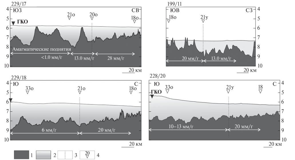 Сейсмические данные, полученные в российских и австралийских антарктических экспедициях [Stagg et al., 2005; Лейченков и др. 2015] в пределах Австрало-Антарктической котловины и сопряженных переходных зонах, демонстрируют общий подъем и отчетливое изменение морфологии фундамента по мере его омоложения (рис. 2, рис. 4). Между аномалиями 33 и 21 фундамент обычно характеризуется относительно длиннопериодным рельефом, а после аномалии 21 – короткопериодным и малоамплитудным (особенно отчетливо такая закономерность отмечается в западной части района исследований). Это изменение совпадает с заметным (почти в два раза) увеличением скорости спрединга (рис. 1, рис. 4). Сейсмические исследования показывают, что ранняя океаническая кора Австрало-Антарктической котловины между 33 и 21 аномалиями, развивавшаяся в условиях ультрамедленного спрединга (определяемая нами как протоокеаническая кора) характеризуется развитием сбросов, которые формируют полуграбены растяжения в кровле фундамента (второго океанического слоя) и проникают до границы Мохо, а также значительными вариациями мощности (от 7 до 2 км, рис. 2). Это, вероятно, связано с развитием тектонических срывов (детачментов) и выходом пород нижней коры и серпентинизированной мантии на поверхность («core complexes» в зарубежной литературе).
