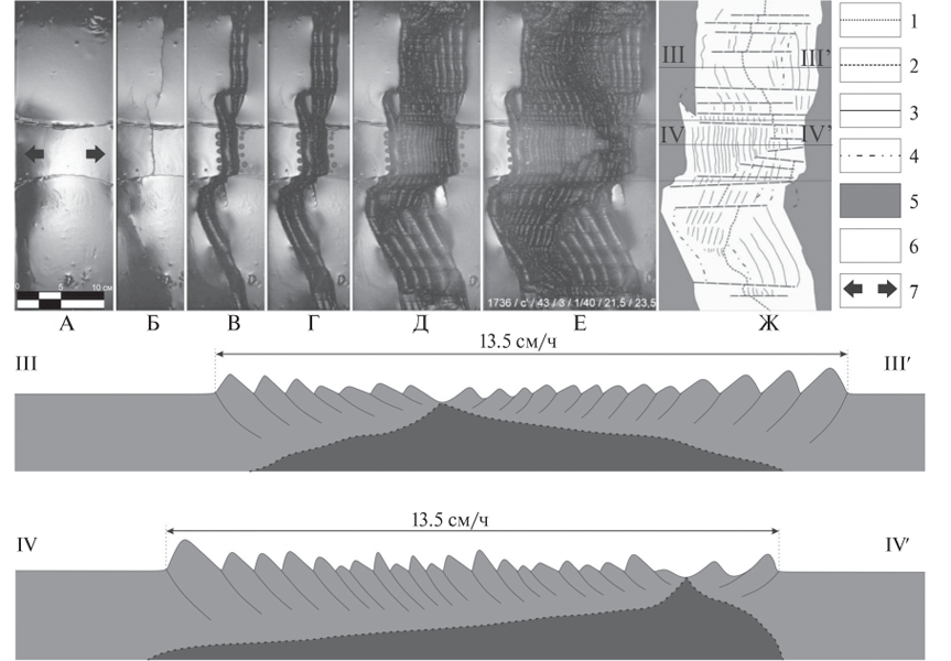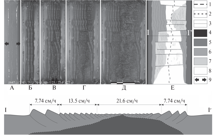 Эксперимент 1647 (рис. 5). Скорость первоначального растяжения задавалась равной 9 см/ч (2.5 ´ 10–5 м/с.). В центральной и нижней областях в пределах ослабленной зоны произошло разрушение сплошности моделируемой коры, в виде индивидуальных трещин, формирующих первоначальную сегментацию спрединговой оси (рис. 5А). Постепенно трещины первоначальной сегментации удлинялись, соединялись друг с другом и затем образовали единую спрединговую ось. В дальнейшем в ходе наращивания модельной литосферы началось образование валообразных структур шириной 1 см и высотой 0.3– 0.5 см (рис. 5Б). На разрезе по линии I–I¢ (см. рис. 5) они представлены наиболее крупным рельефом в его краевых частях. В период формирования первых трех валов произошло два разнонаправленных перескока оси спрединга, изменивших ее линейность (рис. 5Б, 5В). Раскрытие на этой стадии происходило асимметрично.