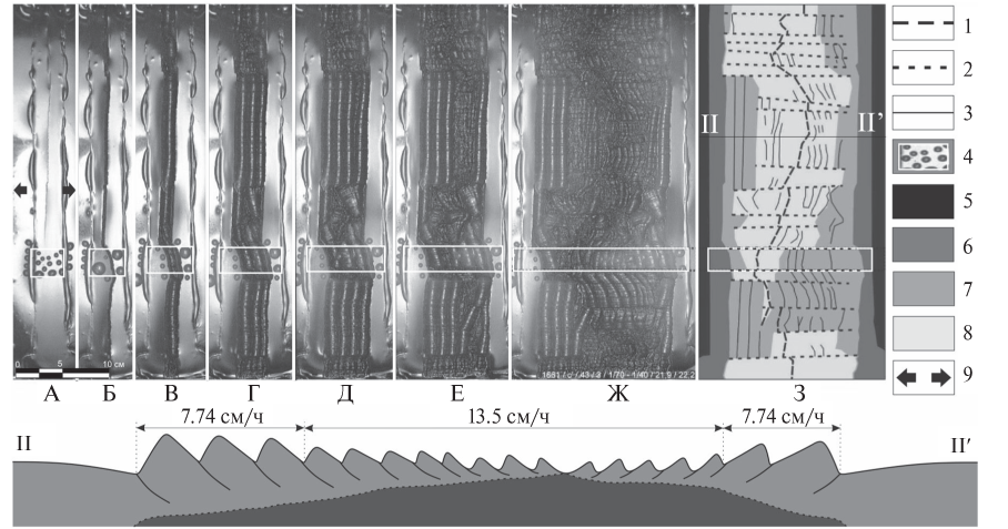 Рис. 6. Формирование и эволюция рельефа при наличии в литосфере прочного блока (эксперимент № 1661). Вверху: стадии эволюции А–Ж – фото (вид сверху); З – структурная схема стадии Ж. Условные обозначения: 1 – действую-щая ось спрединга; 2 – зоны поперечных смещений; 3 – границы между аккреционными валами; 4 – границы блока с более прочной модельной литосферой; 5 – зона континентальной литосферы; 6 – зона растяжения (утонения) континентальной литосферы; 7 – зона эксгумации мантии при ультрамедленной аккреции (протокора); 8 – зона медленного спрединга; 9 – направление растяжения. Внизу: схематичный рельеф и разрез модельной литосферы по линии II – II. Светлым цветом показан твердый слой модели, имитирующий литосферу, верхний (хрупкий) слой которой нарушен предполагаемыми сбросами; темным – жидкий расплав, имитирующий астеносферу.