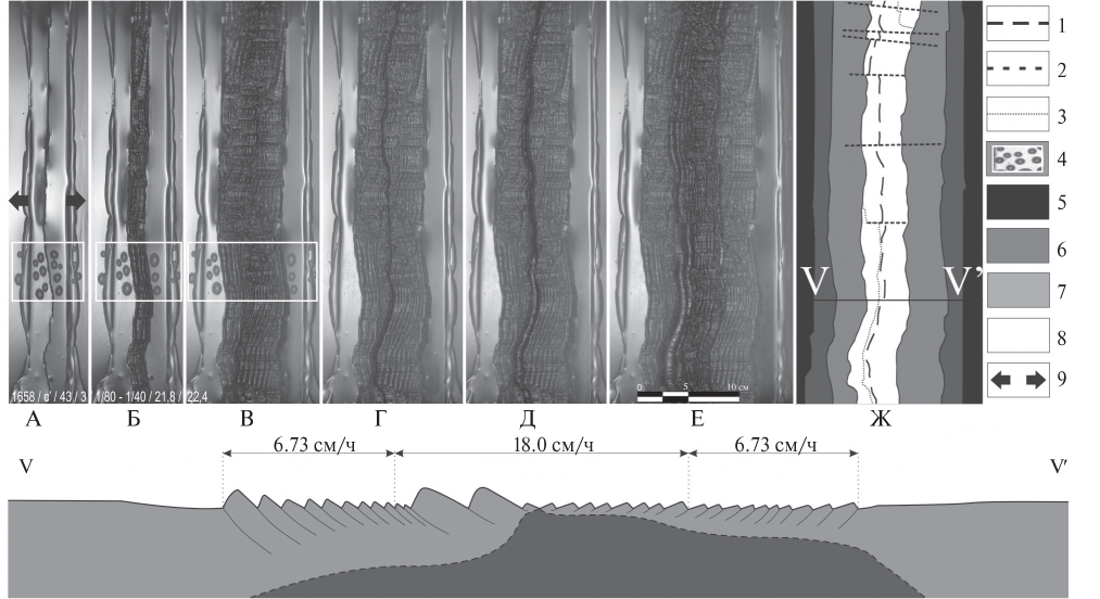 Результаты физического моделирования раннего этапа разделения Австралии и Антарктиды позволили выявить особенности морфологии поверхности океанической (магматической) коры, развивавшейся в условиях перехода от ультрамедленного, к медленному и среднему спердингу. Последовательное увеличение скорости спрединга позволило установить различный характер структурообразования на каждом этапе изменения скорости (рис. 5).