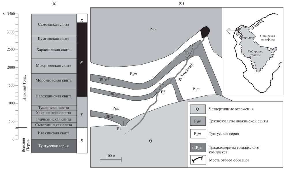 Рис. 1. (а) – Магнитостратиграфия туфо-лавовой толщи Норильского района (по [Heunemann et al., 2004; Gurevitch et al., 2004; Pavlov et al., 2015]): N – прямая полярность; R – обратная полярность; Т – переходная зона; (б) – геологическая схема района исследований: Е1 – силл Ергалах-1; Е2 – силл Ергалах-2; Е3 – силл Ергалах-3.