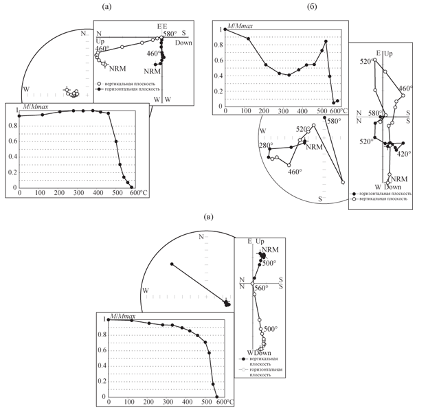 Также в образцах были выделены две стабильные компоненты, имеющие обратную и прямую полярность. Компонента обратной полярности (далее R-компонента) изолируется преимущественно в температурном интервале 520–580 °C; в редких случаях от 280–330 °C или до 600 °C. Направления этой компоненты, как правило, близки к направлениям, полученным ранее для трахибазальтов ивакинской свиты [Heunemann et al., 2004; Павлов и др., 2011; и др.], однако отдельные образцы отличаются более низкими наклонениями (до –30…–45°), не характерными для траппов Сибирской платформы. R-компонента выделяется в интрузиях Е1 и Е2 в общей сложности в 19 образцах и во всех случаях является высокотемпературной. При этом в 9 случаях R-компонента является единственной стабильной, помимо вязкой L-компоненты (рис. 2а). В остальных образцах, кроме высокотемпературной R-компоненты, присутствует также среднетемпературная компонента прямой полярности (см. ниже).