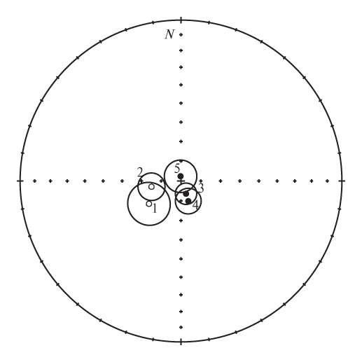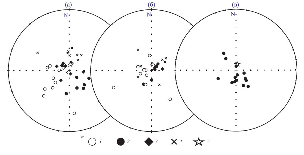 Рис. 3. Распределение направлений R- и N-компоненты внутри сайтов. Стереографическая проекция, географическая система координат: 1 – R-компонента, обратная полярность; 2 – высокотемпературная N-компонента, прямая полярность; 3 – среднетемпературная N-компонента, прямая полярность; 4 – L-компонента; 5 – рассчитанное по модели IGRF направление современного геомагнитного поля; (а) – интрузия Е1; (б) – Е2; (в) – Е3.
