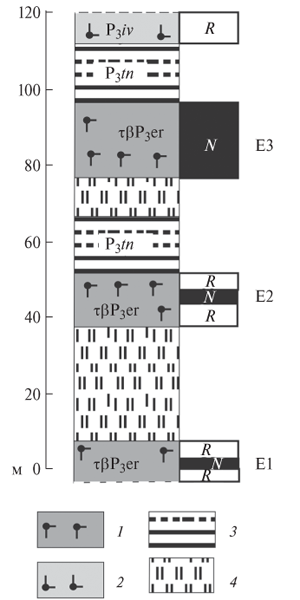 Рис. 4. Магнитостратиграфический разрез района исследований. Цифрами обозначены: 1 – трахидолериты ергалахского комплекса; 2 – трахибазальты ивакинской свиты; 3 – осадочные породы тунгусской серии; 4 – четвертичные отложения. Справа от колонки цветом показана магнитная полярность: N – прямая; R – обратная. Полярность в ивакинской свите показана по [Heunemann et al., 2004].