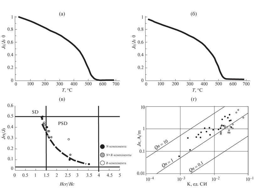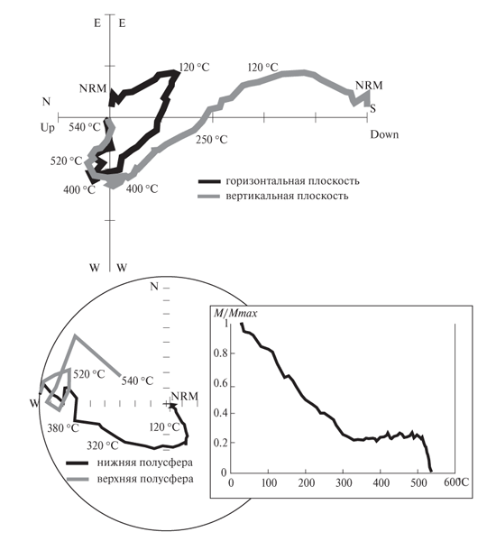 Непрерывное терморазмагничивание проводилось на трехкомпонентном магнитометре конструкции Ю.К. Виноградова в Геофизической обсерватории «Борок» (Ярославская область). Температурные кривые намагниченности насыщения измерялись на вибромагнитометре конструкции Ю.К. Виноградова в поле 0.7 Тл. Петли гистерезиса снимались на вибромагнитометре РМС MicroMag 3900 при комнатной температуре с величиной поля насыщения 0.5 Тл. Доменная структура ферромагнитных зерен оценивалась по диаграмме Дэя [Day et al., 1977]. Измерения анизотропии магнитной восприимчивости проводились на каппометре MFK-1 FA компании AGICO. Обработка измерений выполнялась в программе Anisoft 4.2 с использованием статистических методов, описанных в работе [Jelinek, 1978].