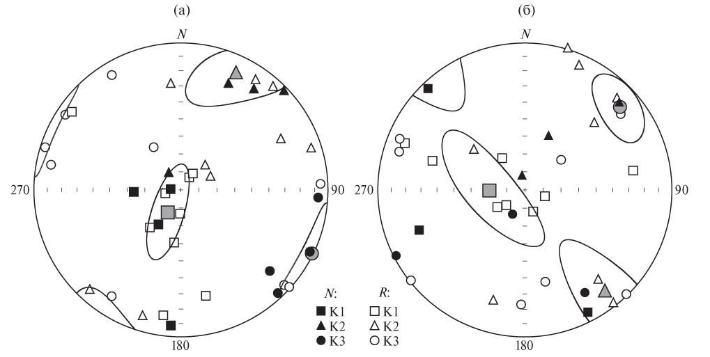 Случаи самообращения остаточной намагниченности неоднократно фиксировались в траппах Сибирской платформы как в вулканитах [Гусев, 1967; Фетисова и др., 2014], так и в интрузиях [Гапеев, Грибов, 2008; Щербаков и др., 2017]. Для рассматриваемых нами интрузивных тел эта гипотеза, однако, представляется маловероятной. Прежде всего, практически во всех образцах, несущих одновременно N- и R-компоненту Jn, эти компоненты не являются антиподальными, в отличие от всех известных нам случаев самообращения, связанного с Сибирскими траппами [Веселовский и др., 2003; Гапеев, Грибов, 2008; Щербаков и др., 2017]. Это подтверждается и отрицательными результатами теста обращения. Кроме того, в случае самообращения остается неясным присутствие большого