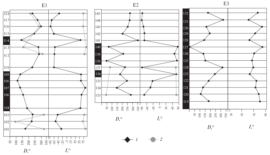 Отбор палеомагнитных образцов производился вручную, их ориентировка в пространстве – с помощью магнитного компаса, с постоянным контролем возможного влияния сильно магнитных пород на стрелку компаса. Из каждого сайта было отобрано от 13 до 18 образцов. Общее количество ориентированных образцов из 3 силлов составило 45. Отбор осуществлялся снизу вверх по разрезу интрузии с шагом от 0.1–0.5 м (силл Е1) до 1–1.5 м (силл Е3). В общей сложности опробованная мощность интрузии Е1 составила 11 м, интрузии Е2 – 14 м, интрузии Е3 – 20 м. Величина местного магнитного склонения рассчитывалась по модели IGRF. Лабораторные палеомагнитные исследования и обработка результатов магнитных чисток выполнялись в лаборатории Главного геомагнитного поля и петромагнетизма ИФЗ РАН. Все образцы были подвергнуты ступенчатой температурной чистке до полного размагничивания (11–14 шагов), которое достигалось при температурах 540–600 °C. Для размагничивания образцов использовались немагнитные печи «MMTD-80» с величиной нескомпенсированного поля не более 5–10 нТл. Остаточная намагниченность образцов измерялась при помощи спин-магнитометра JR-6 AGICO. Обработку измерений остаточной намагниченности выполняли при помощи пакетов программ Enkin [Enkin, 1994] и Remasoft [Chadima, Hrouda, 2006], использующих при выделении компонент намагниченности метод компонентного анализа [Kirschvink, 1980]. Анализ полученных данных производился с использованием статистики Фишера [Fisher, 1953].