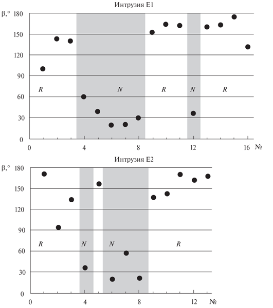 Чтобы наглядно представить изменения направления геомагнитного поля по разрезу интрузий, мы показали на рис. 10 тренд движения виртуальных геомагнитных полюсов (VGP), рассчитанных по высокотемпературной компоненте намагниченности образцов интрузий Е1 и Е2, подобно тому, как это сделано в работе [Valet et al., 2012]. По оси абсцисс показан порядковый номер образца в разрезе интрузии от подошвы к кровле; по оси ординат – угловое расстояние b между VGP, рассчитанным по данному образцу, и палеомагнитным полюсом NMK, полученным по пермо-триасовым эффузивным траппам Сибирской платформы [Pavlov et al., 2011]. Центральные части интрузий с b = 0°–30° и краевые зоны силлов с b = 150°–180° отвечают стабильному геомагнитному полю прямой и обратной полярности, соответственно, а образцы с промежуточными величинами b, согласно [Valet et al., 2012], маркируют переходный интервал. Характерных экскурсов, сопутствующих инверсии, не удается с уверенностью обнаружить ни в одном из разрезов, что может являться результатом недостаточно детального опробования интрузий. Тем не менее, в прямо намагниченном интервале силла Е1 достаточно четко прослеживается тренд от «инверсионных» VGP (b > 30°) к стабильному полю прямой полярности, а в верхней части силла Е2 – движение VGP от стабильного поля обратной полярности к инверсионному интервалу (β уменьшается от 180° до 135°).