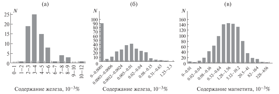 Рис. 1. Гистограммы концентраций железа (а), (б) и магнетита (в) в осадках разных регионов мира – сумма результатов ТМА по осадкам Жомболокского района (а) и по всем изученным ранее осадкам (б), (в).