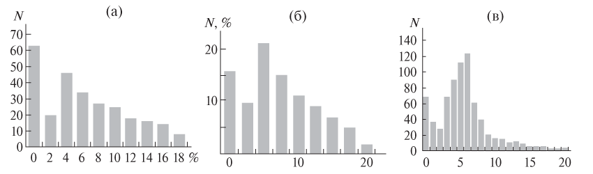 Рис. 2. Гистограммы концентраций никеля (%) в самородном железе: (а) – осадки Атлантики; (б) – эпиконтинентальные осадки северной Евразии [Печерский и др., 2011]; (в) – металлическая часть каменных метеоритов [Печерский и др., 2011; 2012]. N – число определений. Данные МЗА и ТМА.