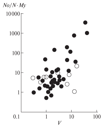 Рис. 3. Связь относительной величины «нулевой» группы частиц самородного железа со скоростью осадконакопления. No – число образцов, в которых не обнаружены (отсутствуют) частицы самородного железа; N – общее число измеренных образцов в данном интервале, My – линейный интервал времени в миллионах лет. Полыми кружками выделены те интервалы, где заметна роль переотложения.