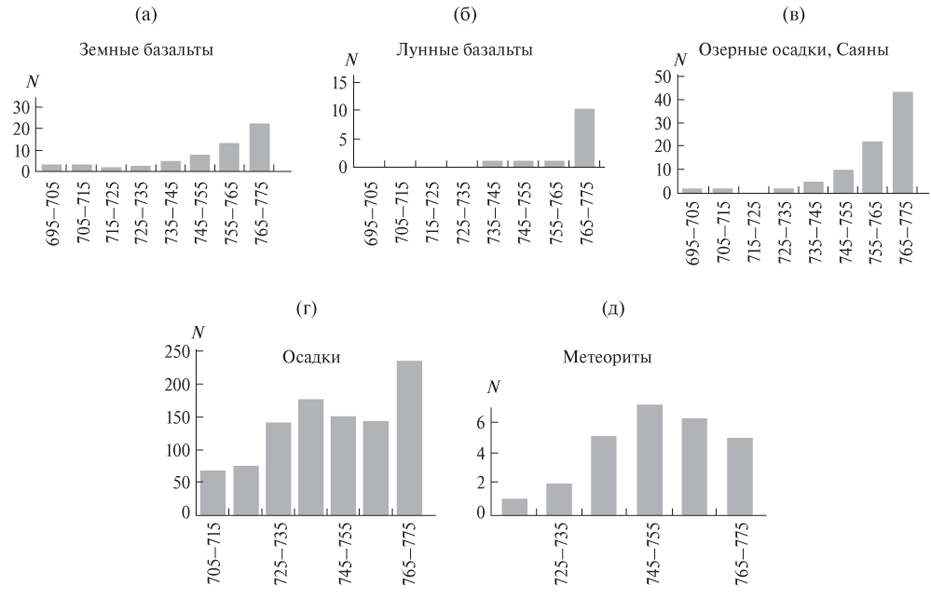Гистограммы точек Кюри (Тс) у осадков всех регионов и возрастов (рис. 4г) ближе к таковым для метеоритов (рис. 4д) и заметно отличаются от гистограмм Тс земных базальтов и базальтов Луны (рис. 4а, 4б) [Nagata et al., 1974]. Гистограмма Тс осадков озер Жомболокского района (рис. 4в) совершенно не похожа на остальные осадки и аналогична земным и лунным базальтам (рис. 4а, 4б).