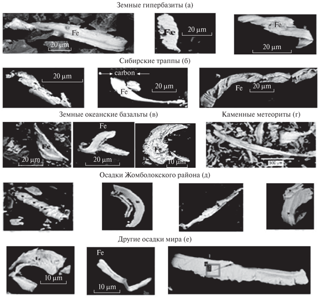 По составу, форме (рис. 5) и размеру (рис. 6) частицы железа земного и внеземного происхождения практически идентичны. Гистограммы на рис. 6 почти повторяют друг друга, особенно это видно по одинаковым модам размера частиц (10–20 мкм). Это можно объяснить едиными условиями происхождения частиц железа в процессе формирования планет и других космических тел, являющихся источником самородного железа в межпланетной пыли и в земных осадках. Поэтому нет особых генетических признаков различия частиц железа земного и внеземного происхождения, есть разные условия их образования. Термины «земное или внеземное» определяют лишь местонахождение источника частиц железа. Очевидно, частицы самородного железа при воздушном разносе быстро оседают недалеко от места извержения вулкана: концентрация магнитных частиц уменьшается на расстоянии 450 км в 10 раз, на расстоянии 880 км в 100 раз [Evans,1999]. Такой вывод следует отнести не только к вулканическим источникам самородного железа.