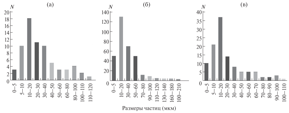 Рис. 6. Гистограммы размеров частиц железа в осадках озер Жомболокского района (а), в осадках разных регионов Земли (б), в земных базальтах (в).