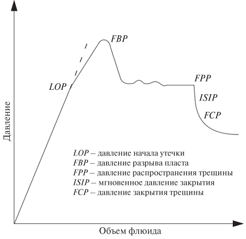 Согласно схеме, представленной на рис. 1, давление закачиваемого флюида ведет себя нелинейно в течение процесса развития трещины: сначала происходит линейное его возрастание как функции от объема закачиваемого флюида (или времени, если происходит закачка с постоянным расходом). В определенный момент линейная зависимость нарушается из-за начала утечек (на рис. 1 этому моменту начала утечек соответствует величина давления LOP). Разрыв породы происходит при достижении давления разрыва пласта FBP, после чего происходит уменьшение давления до величины FPP давления распространения трещины. Согласно оценкам [Hickman, Zoback, 1983], эта величина уже является достаточно близкой к величине минимального главного напряжения σ3. Тем не менее, более точная оценка достижима после прекращения закачки и быстрого спада давления до величины мгновенного давления закрытия ISIP и дальнейшего спада до величины давления закрытия трещины FCP. В зависимости от условий проведения теста последние две величины могут быть близки к значению σ3 на глубине проведения исследования [Zoback, 2007]. В зависимости от тектонических условий в регионе эта величина соответствует или минимальному горизонтальному напряжению σh, или вертикальному напряжению σV. Таким образом, если минимальное главное напряжение горизонтально, данный метод позволяет определить σh.