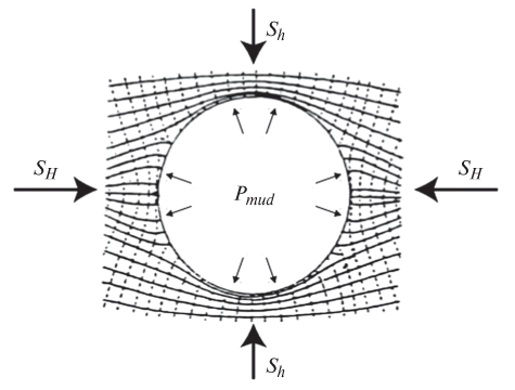 В основе этого подхода лежит изучение процесса разрушения горной породы, вызванного бурением в ней скважины. Как было показано выше, при бурении вокруг сечения скважины возникает концентрация напряжений, описываемая выражениями (5). Величины возникающих напряжений определяются условиями бурения и значениями горизонтальных напряжений на рассматриваемой глубине. Если возникающих напряжений достаточно для того, чтобы преодолеть критерий разрушения, в окрестности скважины порода может разрушиться, образуется так называемый вывал, а сечение скважины теряет круговую форму (рис. 3).
