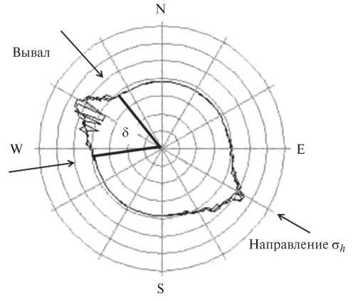 На рис. 3 изображено сечение скважины горизонтальной плоскостью. Видно, что на симметричных участках круговое сечение сильно искажается. Это искажение максимально в направлении действия минимального горизонтального напряжения и может быть описано с помощью угла δ, представляющего угловую меру дуги разрушенной породы.