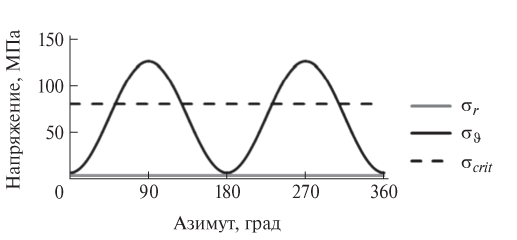Видно, что напряжение имеет максимумы при = 90° и 270°, то есть в направлении действия σh. Согласно условию неразрушения (9) вывал произойдет, если величина σ1 (равная в направлении действия σh) превысит пороговое значение σcrit, определяемое как: