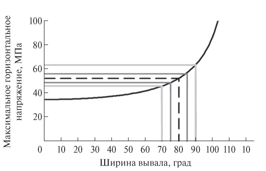 Для рассмотренных условий в случае, если ширина вывала составляет 80°, максимальное горизонтальное напряжение может быть оценено как 52.2 МПа. При этом ошибка в 5° в определении ширины вывала приводит к коридору возможных значений σH от 48.6 до 55.9 МПа, ошибка в 10° ведет к коридору возможных значений 45.863.4 МПа.