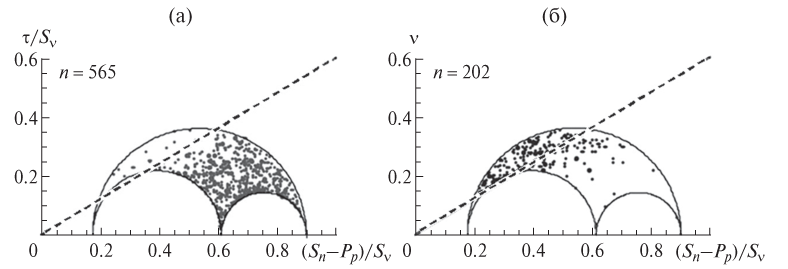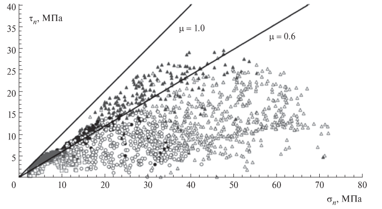 На следующем этапе реконструкции проводится анализ критически напряженных трещин. Для этого управляющие параметры (горизонтальные деформации при использовании пороупругой модели (2) или отношения горизонтальных напряжений к вертикальному при использовании модели (3)) варьируются в некоторых пределах, выбранных так, чтобы на любой глубине не происходило разрушение пород, то есть везде выполнялось условие (9) и, в то же время, не достигалось условие (4). Для каждой пары управляющих параметров определяются критически напряженные трещины: по выражениям (20) определяются нормальное и касательное напряжения, которые далее подставляются в критерий (19). Если неравенство (19) выполняется, трещина считается критически напряженной и наоборот. Важно понимать, что для использования выражений (20) недостаточно только знаний о пространственной ориентации трещин поскольку в этих выражениях используются направляющие косинусы l и n, связывающие ориентацию нормали к плоскости трещины с главными осями тензора напряжений, необходимо также использование профиля азимута θ(z) направления действия σH.Этот угол может быть определен по данным о вывалообразовании (рис. 3) или по общим закономерностям, наблюдаемым в ориентации трещин, следуя общим подходам к реконструкции напряжений по трещиноватости горных пород [Белоусов, Мухамедиев, 1990]. В результате каждая пара управляющих параметров порождает собственную классификацию трещин на критически напряженные и не критически напряженные. Далее анализируется, какие пары горизонтальных напряжений обеспечивают максимальное совпадение между трещинами, критически напряженными при этих управляющих параметрах, и трещинами, выделенными на предыдущем этапе как флюидопроводящие. Степень совпадения может быть определена по интегральным свойствам, характеризующим интервалы глубин с развитой трещиноватостью (доля трещин, являющихся критически напряженными и флюидопроводящими [Дубиня, Ежов, 2017]), или по отдельным трещинам [Ito et al., 2002].