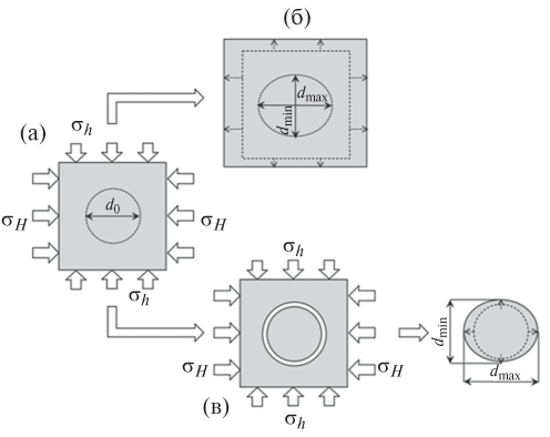 В основе алгоритма лежит принципиальная схема, показанная на рис. 8. Рассматривается горизонтальная плоскость, выбирается некоторая область породы, ограниченная окружностью (а) диаметром d0. В рассматриваемой плоскости на породу действуют горизонтальные напряжения σH и σh. Если эти напряжения снять (б), рассмотренная окружность обратиться в эллипс, большая dmax и меньшая dmin оси которого связаны соотношением (определяемым, в рамках модели изотропной среды, модулем Юнга E и коэффициентом Пуассона v):