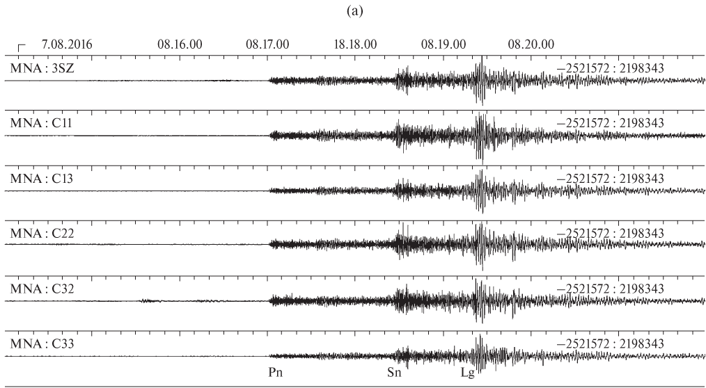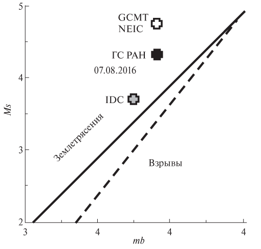 По данным ФИЦ ЕГС РАН магнитуда по объемным волнам составила mb = 4.8 (12 станций на расстояниях от ∆ = 20 до ∆ = 59°), значение магнитуды по поверхностным волнам Мs = 3.8–4.0. В Международном центре данных (International Data Centre – IDC) магнитуды этого события определены mb = 4.5, Ms = 3.7, Каталога GCMT – Ms = 4.8, National Earthquake Information Center (NEIC) mb = 4.8. Все эти значения однозначно показывают природу основного события как землетрясения в соответствии с известными пороговыми значениями магнитудного дискриминанта (см. [Mueller, Murphy, 1971; Murphy et al., 1997], рис. 7).