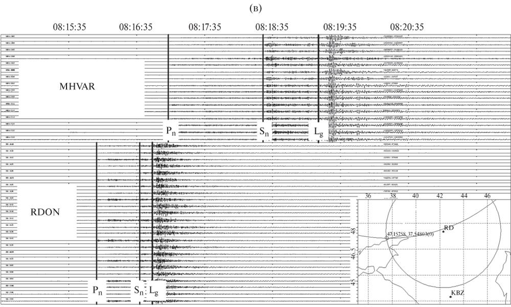 Рис. 1. Примеры исходных записей на вертикальных каналах сейсмических групп: стационарной MHVAR (а) и временной RDON (б) землетрясения 07.08.2016 г., время в очаге 08:15:06; названия каналов приведены слева, шкала амлитудной за-писи – справа, величины даны в отсчетах АЦП. Коэффициенты пересчета: для MHVAR – 7.45 ‧ 10–6 мкм/с, для RDON – 3.16 ‧ 10–3 мкм/с; (в) – показан пример совместной локации данного события по двум группам. Координаты эпицентра даны на врезке.