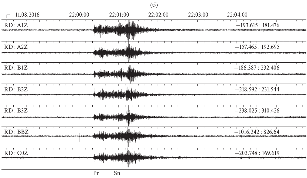 Рис. 2б. Примеры записей на сейсмических группах: стационарной MHVAR (а) и временной RDON (б) афтершока, произо-шедшего 11.08.2016 г., время в очаге 21:59:30. Записи отфильтрованы в полосе 1–5 Гц, каналы вертикальные, названия каналов приведены слева, шкала амлитудной записи – справа, величины даны в отсчетах АЦП. Коэффициенты пересчета: для MHVAR – 7.45 ‧ 10–6 мкм/с, для RDON – 3.16 ‧ 10–3 мкм/с.