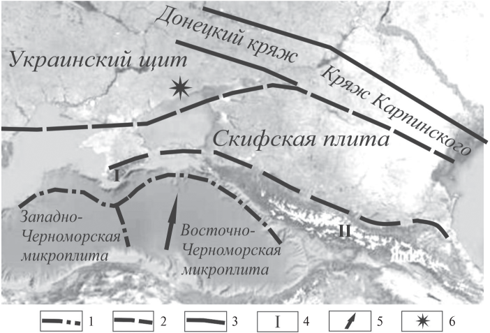 Рис. 3. Геодинамическая схема: 1–3 – границы (1 – микроплит, 2 – Скифской плиты, 3 – девонского палеорифта); 4 – орогены (I – Крымский, II – Кавказский); 5 – направление давления Восточно-Черноморской микроплиты; 6 – эпицентр землетрясения вблизи г. Мариуполь 07.08.2016 г.