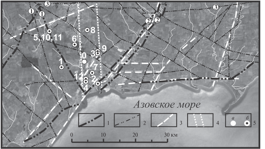 Рис. 4. Компиляционная схема неотектонических разломов и линеаментов: 1–2 – неотектонические разломы (по материалам [Государственная..., 2012]): 1 – основные, 2 – второстепенные; 3 – линеаменты; 4 – Кальчикская линеаментная зона; 5 – эпицентр землетрясения 07.08.2016 г. (а) и его афтершоки (б); цифра – номер; цифры в кружках – номера разломов; 1 – Малоянисольский, 2 – Кальмиусский, 3 – Приморский.