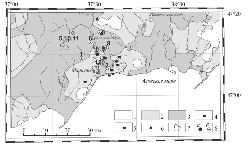 В пределах рассматриваемого региона выделены районы с различной техногенной нагрузкой от слабой до интенсивной ([Государственная..., 2012], рис. 5). Геологическая среда максимально нагружена на территории населенных пунктов и промышленных зон. Наиболее сильное воздействие на ландшафты оказывают горнодобывающие предприятия, в том числе представленные среднемеханизированными карьерами по добыче камня, песка, щебня. В их состав входят два средних карьера площадью 0.5–1 км 2 и несколько десятков мелких, количество которых ежегодно увеличивается. На исследуемой территории находятся Кальчикское и Кальмиусские водохранилища. Изменившаяся в последние годы структура водоснабжения характеризуется увеличением доли подземных вод. Большую нагрузку на среду оказывает комбинат Азовсталь.