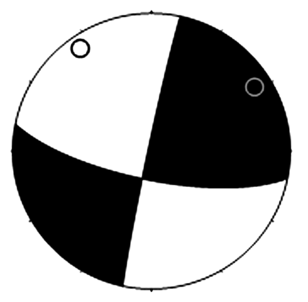 Рис. 6. Решение механизма очага в стереографической проекции по данным Гарвардского GCMT: черные квадраты – дви-жение вверх – волна сжатия, белые квадраты – движение вниз – волна растяжения.