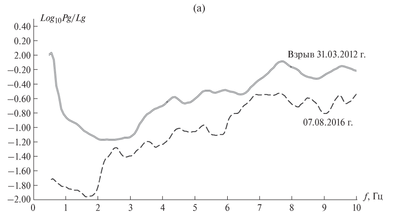 Сопоставление логарифмов отношений спектральных амплитуд волн Pg/Lg, которое обычно используется в качестве станционного дискриминанта вероятностного критерия различия взрывов и землетрясений, также свидетельствует о тектонической природе землетрясения 07.08.2016 г. вблизи г. Мариуполь при сравнении отношений спектральных амплитуд, полученных для взрыва и ряда землетрясений на Украине (рис. 8а, 8б).